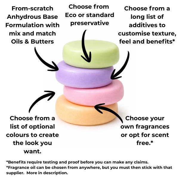 SLSa, SCI, BTMS 50, Cetyl Alcohol, Cocamidopropyl Betaine, Powder and binders of choice (such as Kaolin clay, arrowroot powder, coconut milk powder, charcoal and more), Colourant of choice, Oil and/or Butter of choice (such as Mango, Shea, Cocoa, Jojoba, Argan, Macadamia and more), Additive of choice (such as Panthenol, Hydrolyzed Proteins and more), Sodium Lactate, Preservative of choice (Phenoxyethanol Ethyhexylglycerin OR Preservative Eco), Fragrances of your choice.