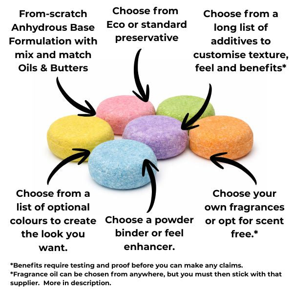 This CPSR - Cosmetic Product Safety Report is for a shampoo bar. Shampoo bars need careful formulation suited to the results you want. This formulation gives a solid foundation for a good shampoo bar that can be customised by mixing and matching the variant options. Choose your oil or butter, powder binder/feel enhancers, your additives, fragrances and colours to make various shampoo bars for different hair types.